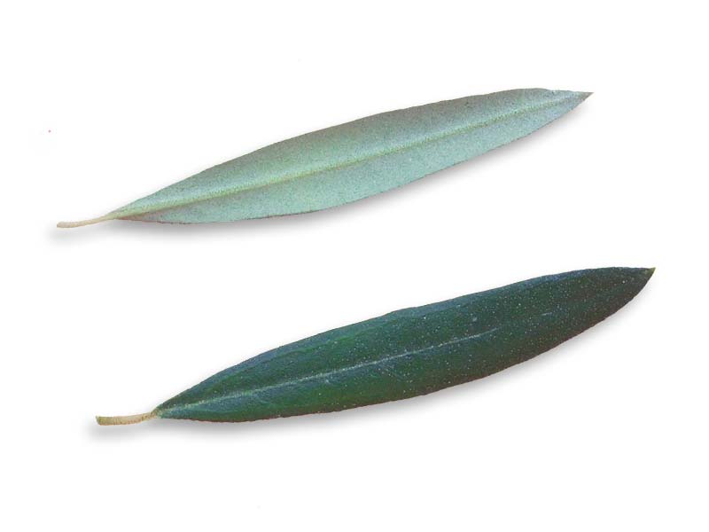| Foglia Lunghezza (cm) Corta (4,9 + 0,5) Larghezza (cm) Media (1,28 + 0,18) Forma Ellittica (3,8 + 0,6) Curvatura longitudinale lamina Iponastica Angolo apice Molto acuto Angolo base Acuto Posizione larghezza max Centrale Superficie lamina (cm) Media (4,5 + 0,90) Colore pagina superiore Verde intenso Colore pagina inferiore Verde chiaro | ![]() |