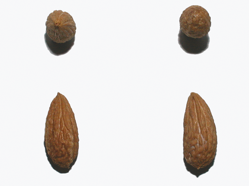 | Endocarpo Peso (g) Molto grande (0,83 ± 0,2) Lunghezza (cm) 1,80 ± 0,21 Larghezza max (cm) 0,84 ± 0,08 Forma Ellittico (2,1 ± 0,26) Simmetria nocciolo Asimmetrico Posizione diametro max Apicale Rilievo superficie Rugosa Numero solchi fibrovascolari Medio Distribuzione solchi fibrovascolari Non uniforme ‘Andamento solchi fibrovascolari Irregolare Rilievo linea di sutura Non evidente Forma sezione trasversale max Circolare Forma apice Arrotondato Forma base Appuntita Mucrone Presente | ![]() ![]() |