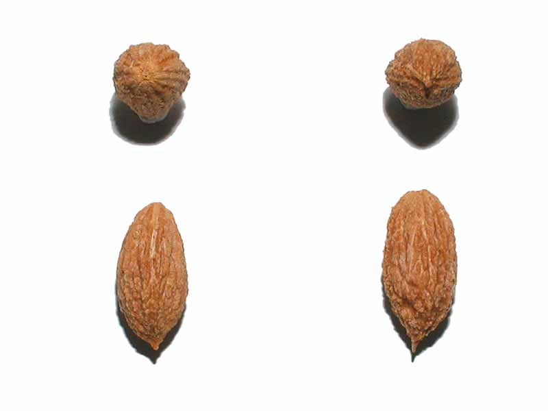 | Endocarpo Peso (g) Molto grande (1,07 ± 0,3) Lunghezza (cm) 1,97 ± 0,26 Larghezza max (cm) 0,98 ± 20,11 Forma Ellittica (2,0 ± 0,24) Simmetria nocciolo Leggermente asimmetrico Posizione diametro max Centrale Rilievo superficie Scabrosa Numero solchi fibrovascolari Medio Distribuzione solchi fibrovascolari Uniforme Andamento solchi fibrovascolari Irregolare Rilievo linea di sutura Evidente Forma sezione trasversale max Circolare Forma apice Arrotondato Forma base Arrotondata Mucrone Presente | ![]() ![]() |